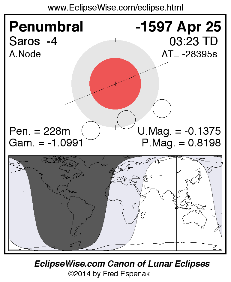 The instant of greatest eclipse takes place on -1597 Apr 25 at 03:22:56 TD (17:03:60 UT1).