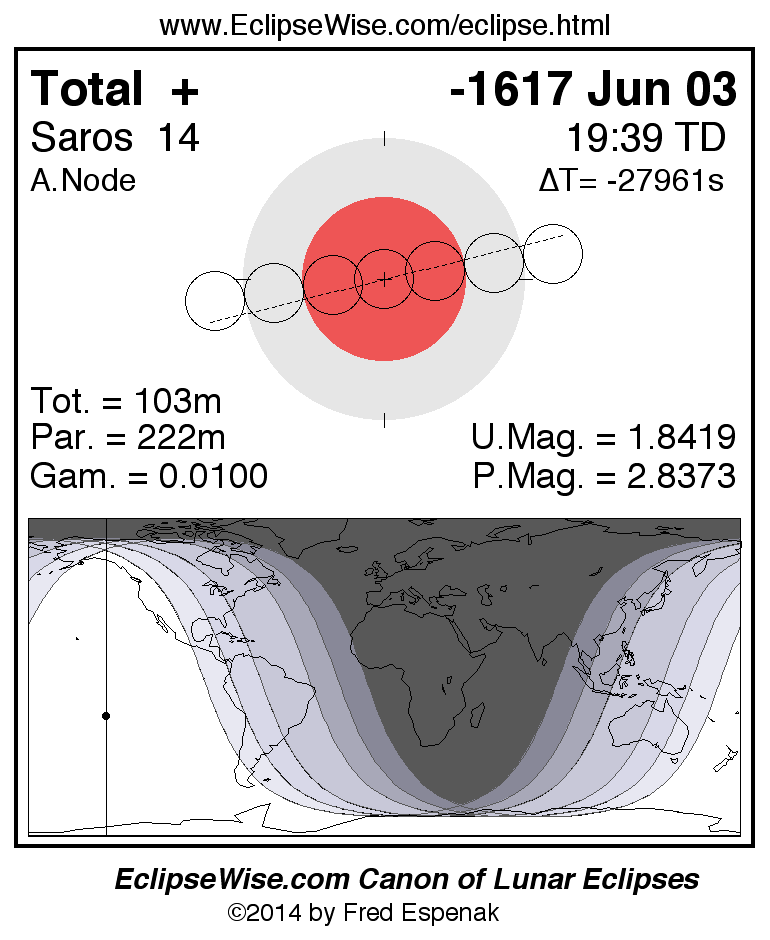 The instant of greatest eclipse takes place on -1617 Jun 03 at 19:38:38 TD (09:12:28 UT1). This is 4.8 days after the Moon reaches perigee. During the eclipse, the Moon is in the constellation Sagittarius. The synodic month in which the eclipse takes place has a Brown Lunation Number of -43779.