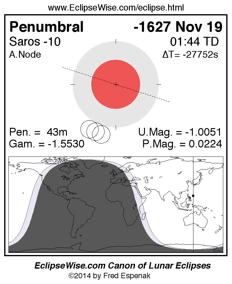 Another lunar eclipse occurs one synodic month after the -1627 Nov 19 eclipse. It is the penumbral lunar eclipse of -1627 Dec 18.