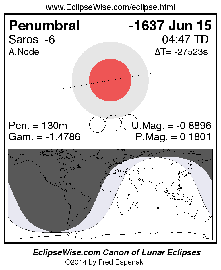 Another lunar eclipse occurs one synodic month after the -1637 Jun 15 eclipse. It is the penumbral lunar eclipse of -1637 Jul 14.