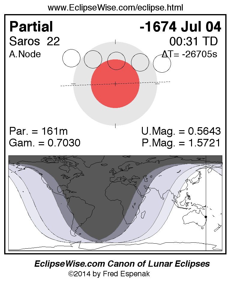 The instant of greatest eclipse takes place on -1674 Jul 04 at 00:30:49 TD (13:43:43 UT1).
