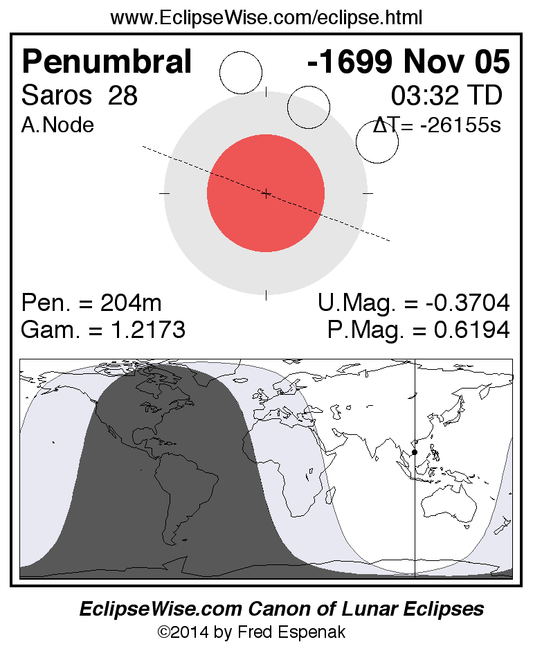 Another lunar eclipse occurs one synodic month before the -1699 Nov 05 eclipse. It is the penumbral lunar eclipse of -1699 Oct 06.