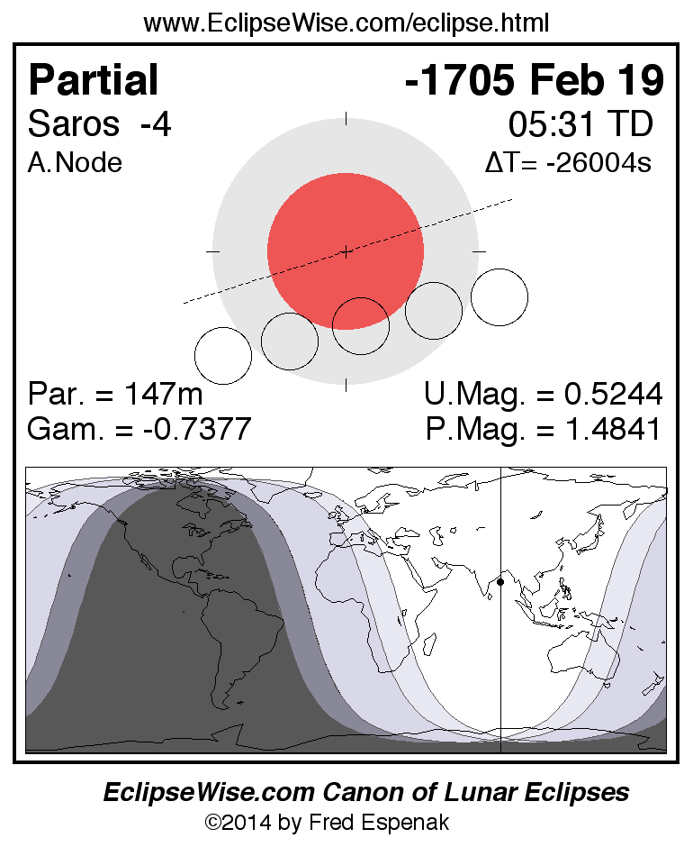 The instant of greatest eclipse takes place on -1705 Feb 19 at 05:31:10 TD (18:32:23 UT1).