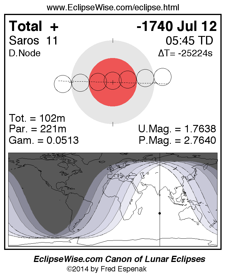 The tables below contain detailed predictions and additional information on the Total Lunar Eclipse of -1740 Jul 12 .