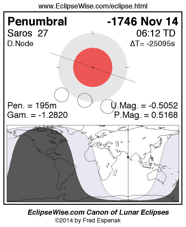 Another lunar eclipse occurs one synodic month before the -1746 Nov 14 eclipse. It is the penumbral lunar eclipse of -1746 Oct 15.