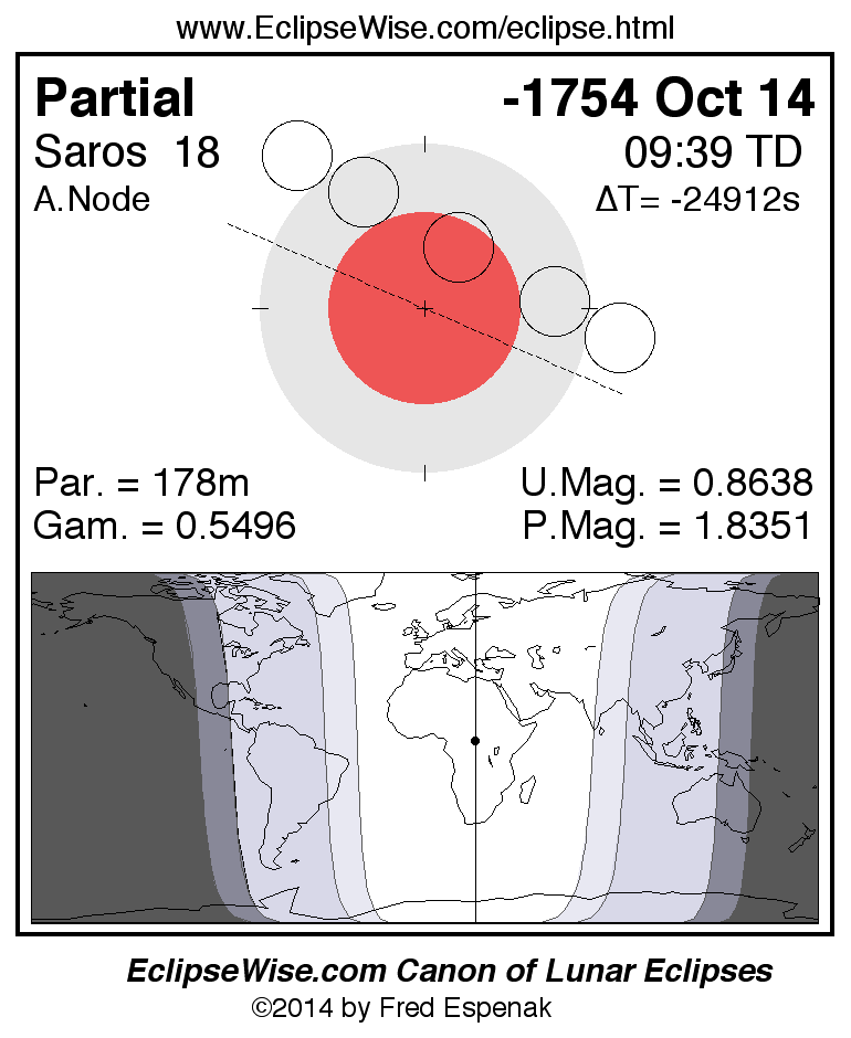 The instant of greatest eclipse takes place on -1754 Oct 14 at 09:38:42 TD (22:21:43 UT1).