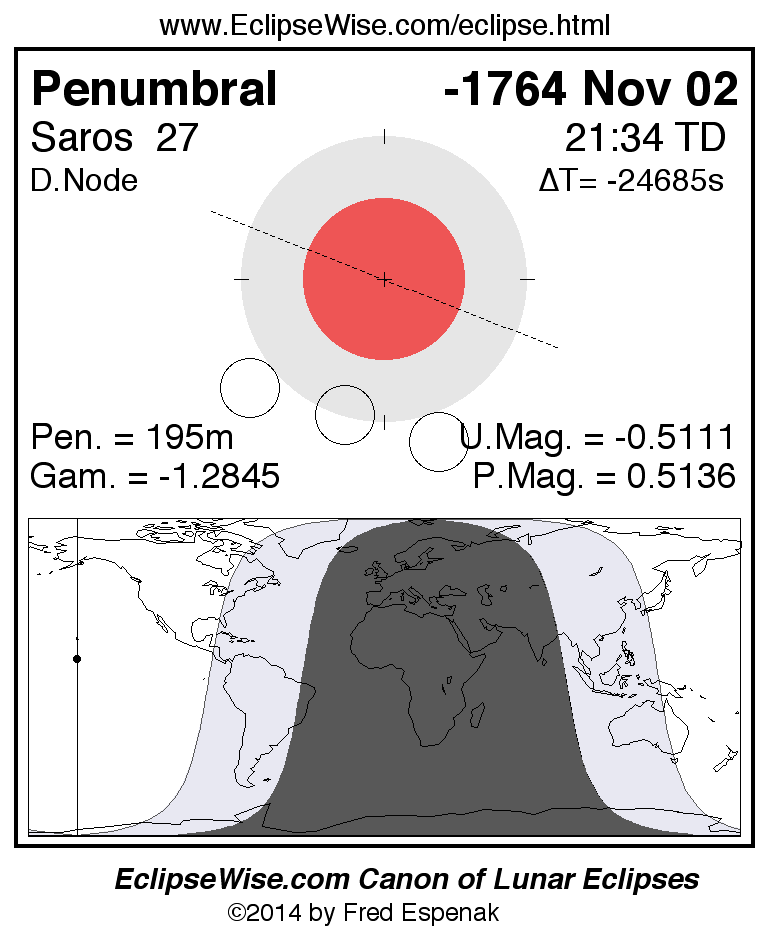 Another lunar eclipse occurs one synodic month before the -1764 Nov 02 eclipse. It is the penumbral lunar eclipse of -1764 Oct 04.