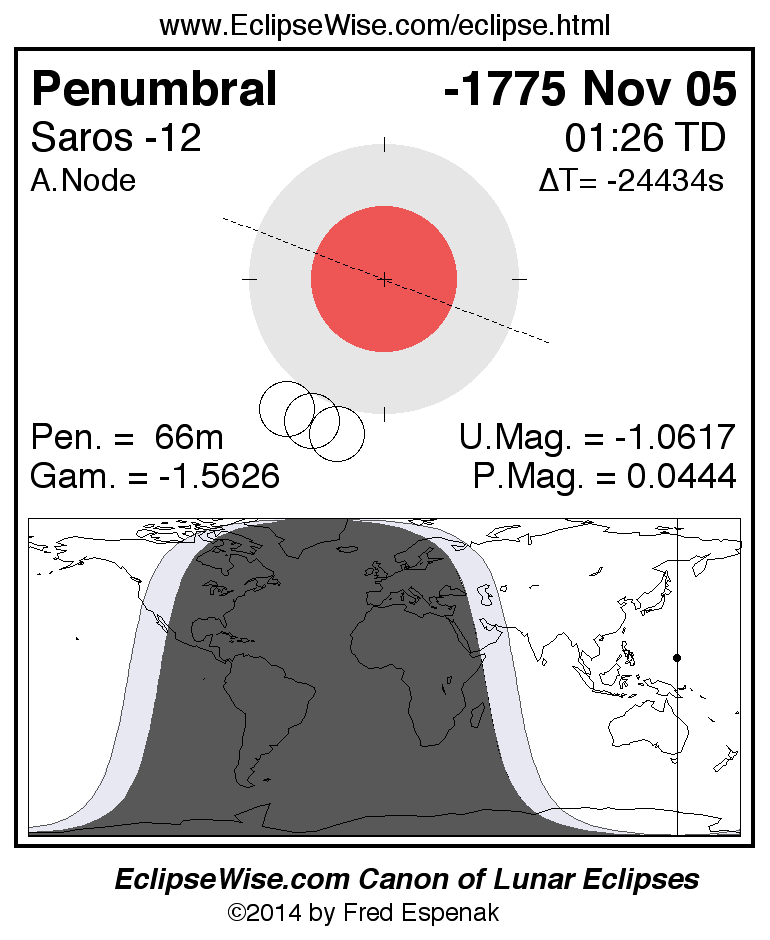 Another lunar eclipse occurs one synodic month after the -1775 Nov 05 eclipse. It is the penumbral lunar eclipse of -1775 Dec 04.