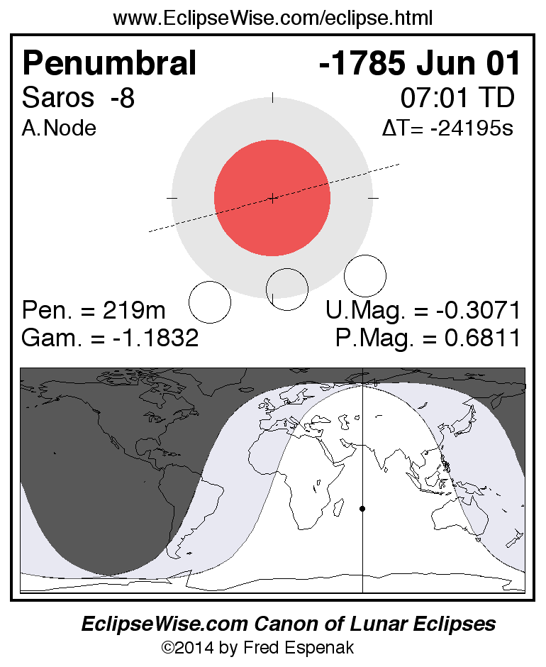 Another lunar eclipse occurs one synodic month after the -1785 Jun 01 eclipse. It is the penumbral lunar eclipse of -1785 Jun 30.