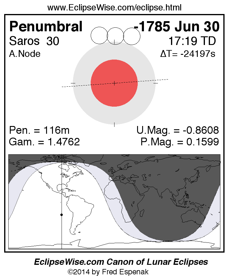 Another lunar eclipse occurs one synodic month before the -1785 Jun 30 eclipse. It is the penumbral lunar eclipse of -1785 Jun 01.