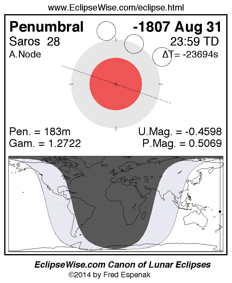 Another lunar eclipse occurs one synodic month before the -1807 Aug 31 eclipse. It is the penumbral lunar eclipse of -1807 Aug 02.