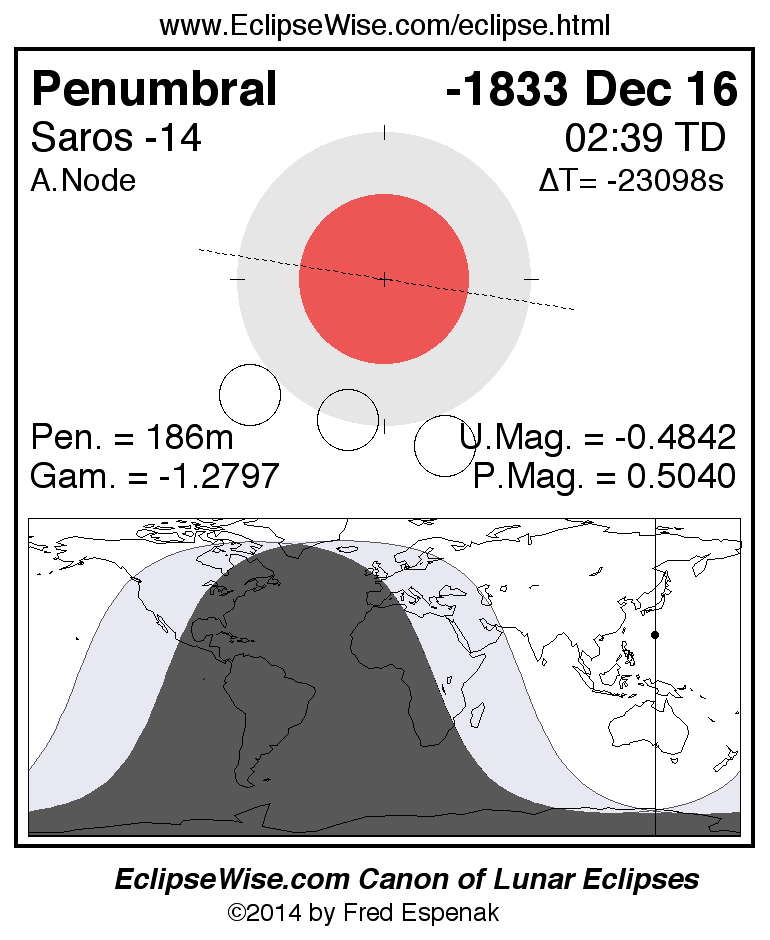 Another lunar eclipse occurs one synodic month after the -1833 Dec 16 eclipse. It is the penumbral lunar eclipse of -1832 Jan 14.