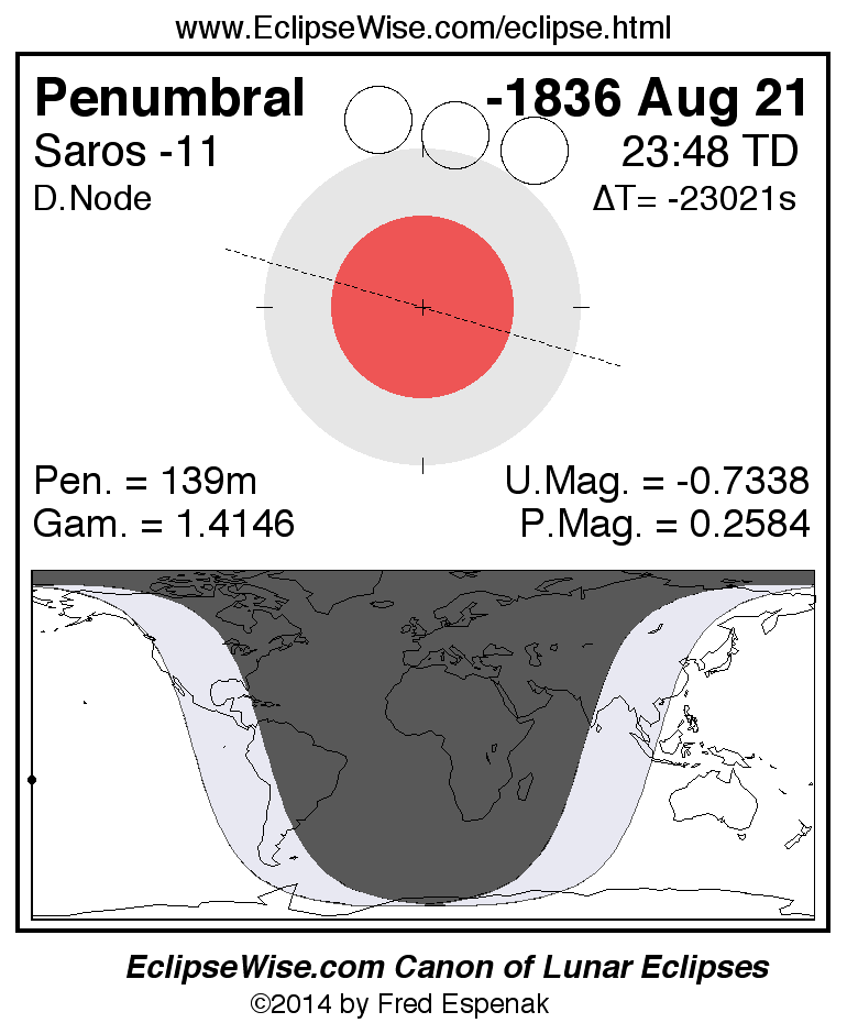 Another lunar eclipse occurs one synodic month after the -1836 Aug 21 eclipse. It is the penumbral lunar eclipse of -1836 Sep 20.