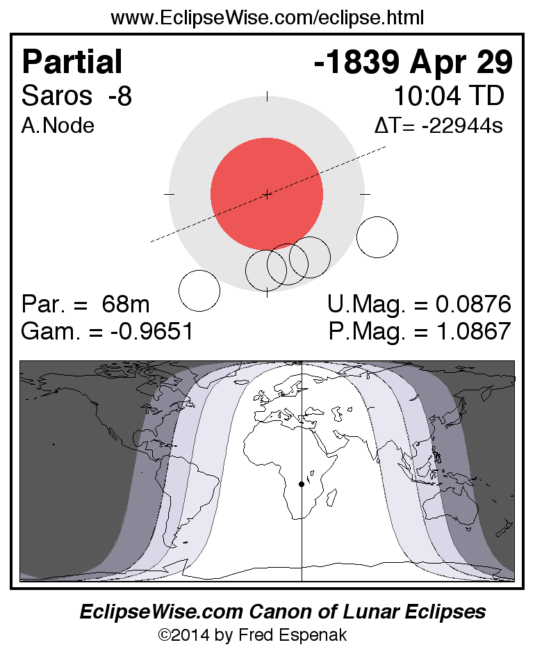 The instant of greatest eclipse takes place on -1839 Apr 29 at 10:04:27 TD (22:14:40 UT1).
