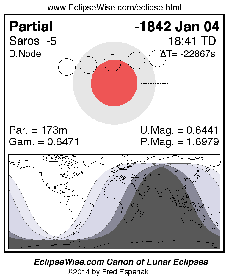 The instant of greatest eclipse takes place on -1842 Jan 04 at 18:40:54 TD (06:49:49 UT1).