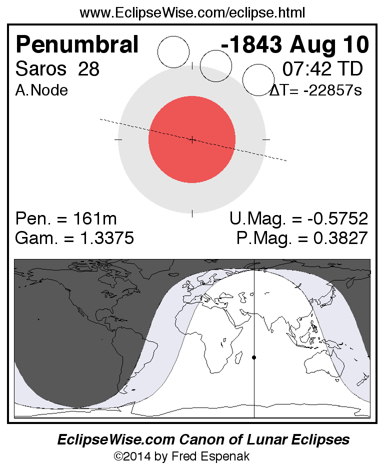 Another lunar eclipse occurs one synodic month before the -1843 Aug 10 eclipse. It is the penumbral lunar eclipse of -1843 Jul 11.