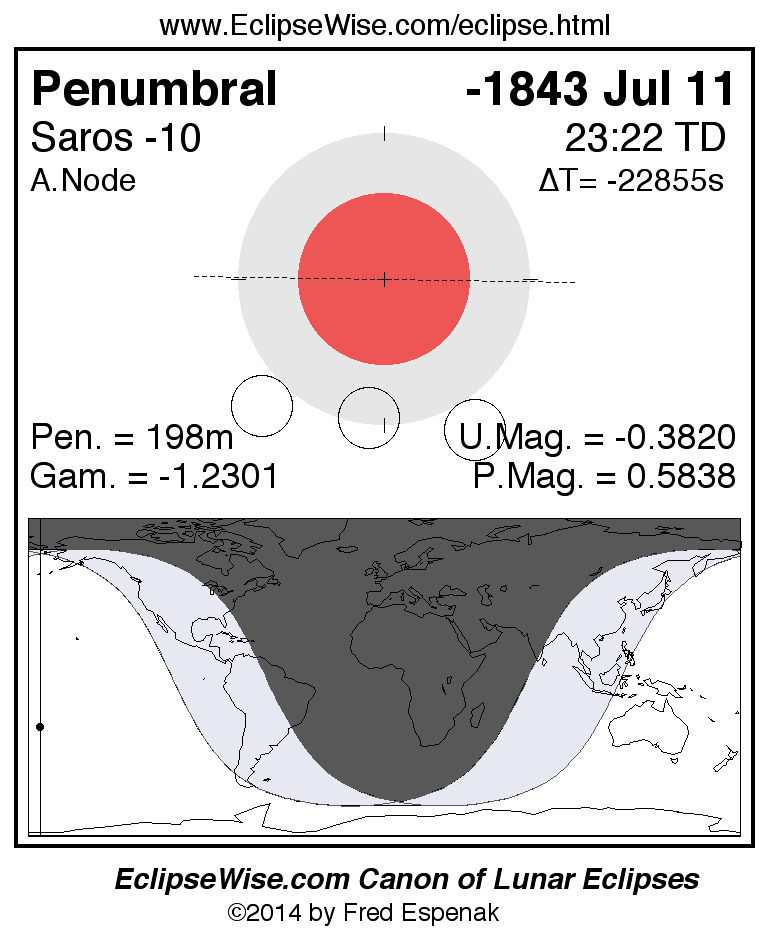 The instant of greatest eclipse takes place on -1843 Jul 11 at 23:22:07 TD (11:30:52 UT1).