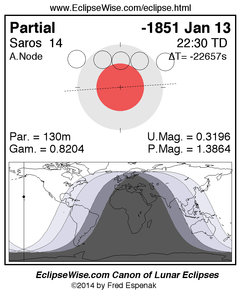 The instant of greatest eclipse takes place on -1851 Jan 13 at 22:30:03 TD (10:35:30 UT1).