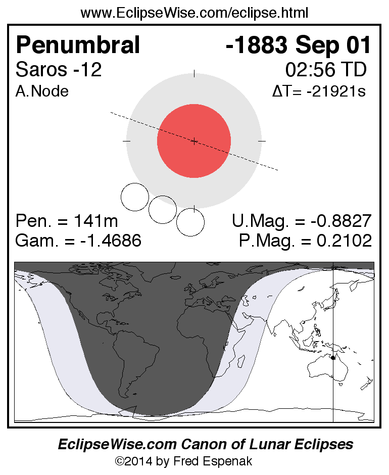 Another lunar eclipse occurs one synodic month after the -1883 Sep 01 eclipse. It is the penumbral lunar eclipse of -1883 Sep 30.