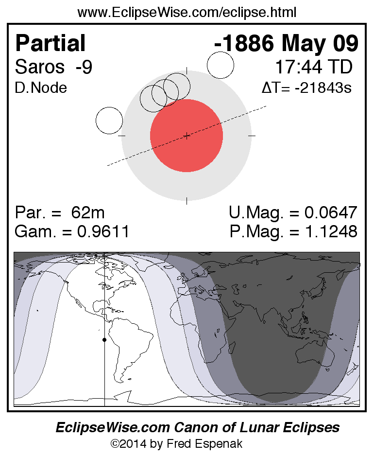 The instant of greatest eclipse takes place on -1886 May 09 at 17:44:05 TD (05:35:57 UT1).
