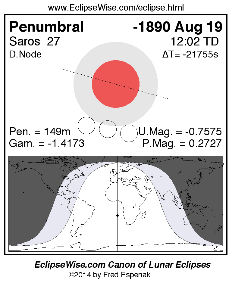Another lunar eclipse occurs one synodic month before the -1890 Aug 19 eclipse. It is the penumbral lunar eclipse of -1890 Jul 21.