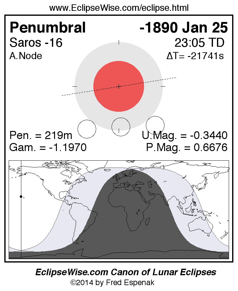 Another lunar eclipse occurs one synodic month after the -1890 Jan 25 eclipse. It is the penumbral lunar eclipse of -1890 Feb 24.