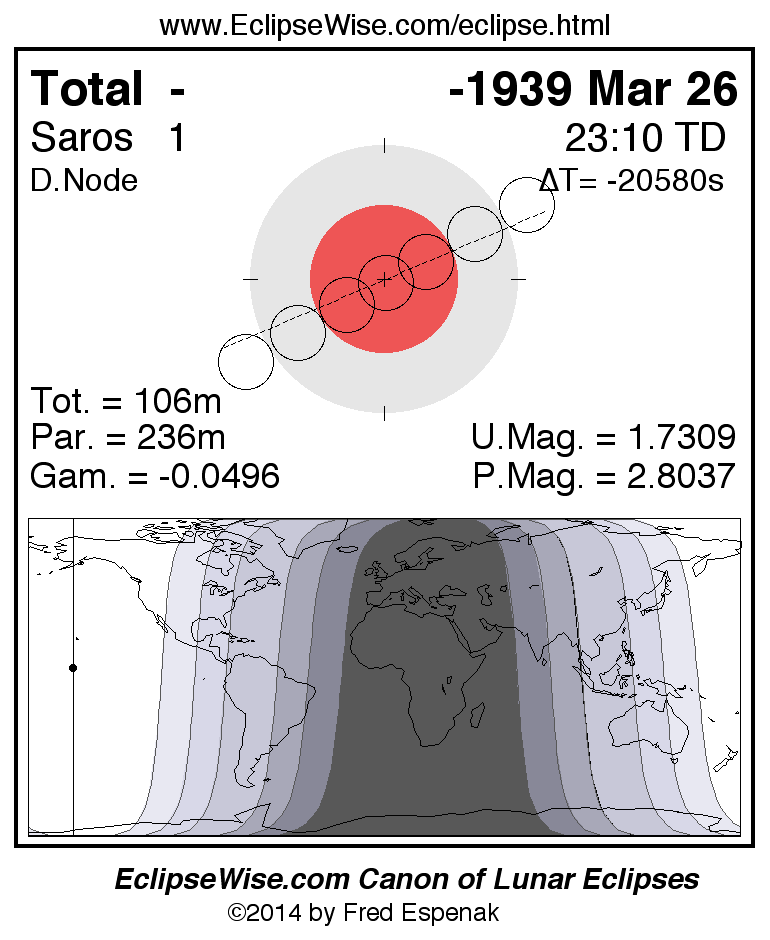 The tables below contain detailed predictions and additional information on the Total Lunar Eclipse of -1939 Mar 26 .
