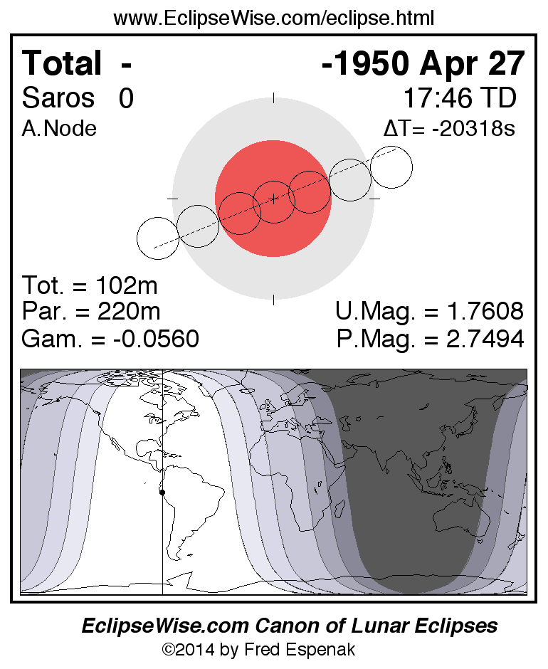 The Total Lunar Eclipse of -1950 Apr 27 (1951 Apr 27 BCE) is visible from the geographic regions shown on the map to the right. The diagram above the map depicts the Moon's path with respect to Earth's umbral and penumbral shadows. Click on the figure to enlarge it. For an explanation of the features appearing in the figure, see Key to Lunar Eclipse Figures.