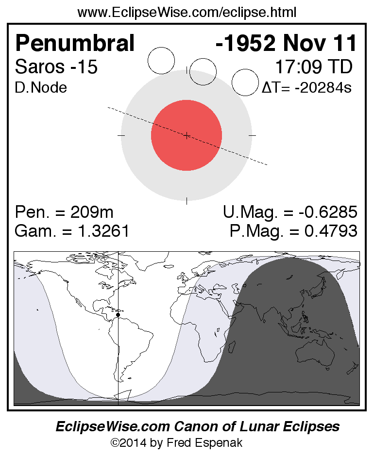 The penumbral lunar eclipse of -1952 Nov 11 is followed two weeks later by a total solar eclipse on -1952 Nov 26.
