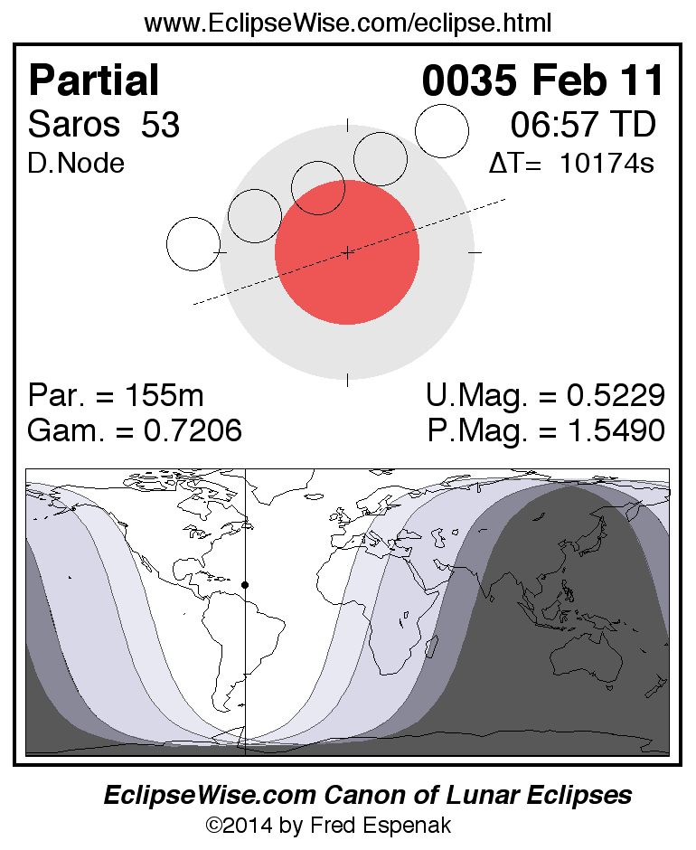 The partial lunar eclipse of 0035 Feb 11 is followed two weeks later by a hybrid solar eclipse on 0035 Feb 26.
