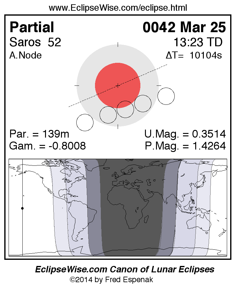 The partial lunar eclipse of 0042 Mar 25 is followed two weeks later by a total solar eclipse on 0042 Apr 08.