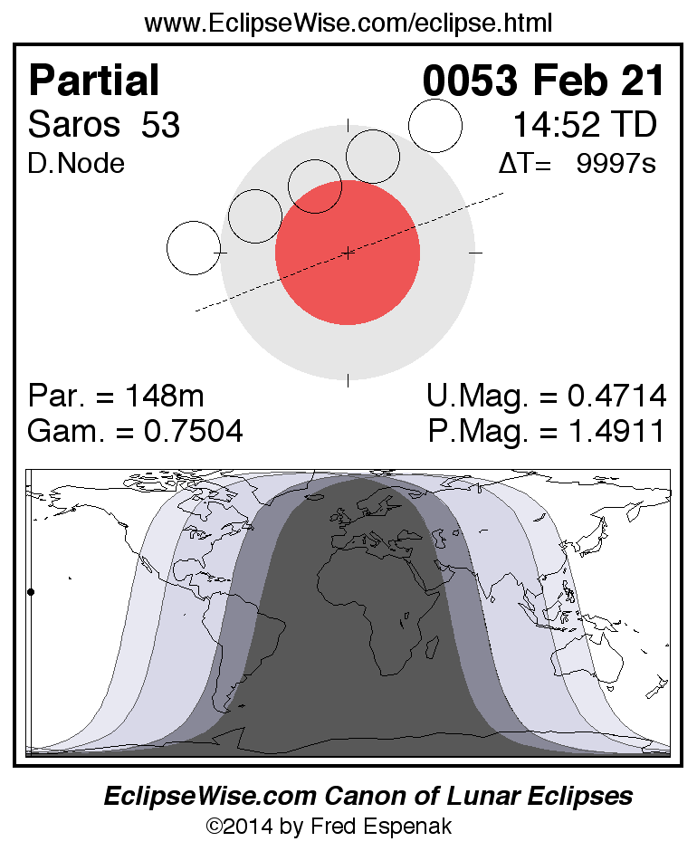 The partial lunar eclipse of 0053 Feb 21 is followed two weeks later by a hybrid solar eclipse on 0053 Mar 09.