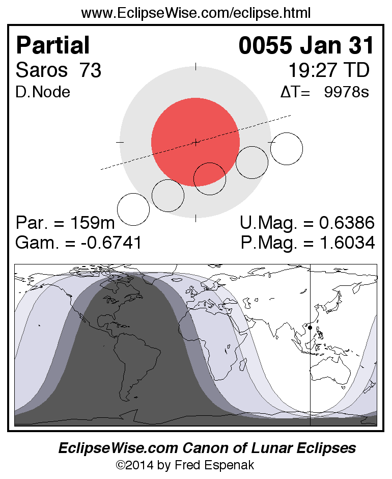 The partial lunar eclipse of 0055 Jan 31 is preceded two weeks earlier by a annular solar eclipse on 0055 Jan 16.