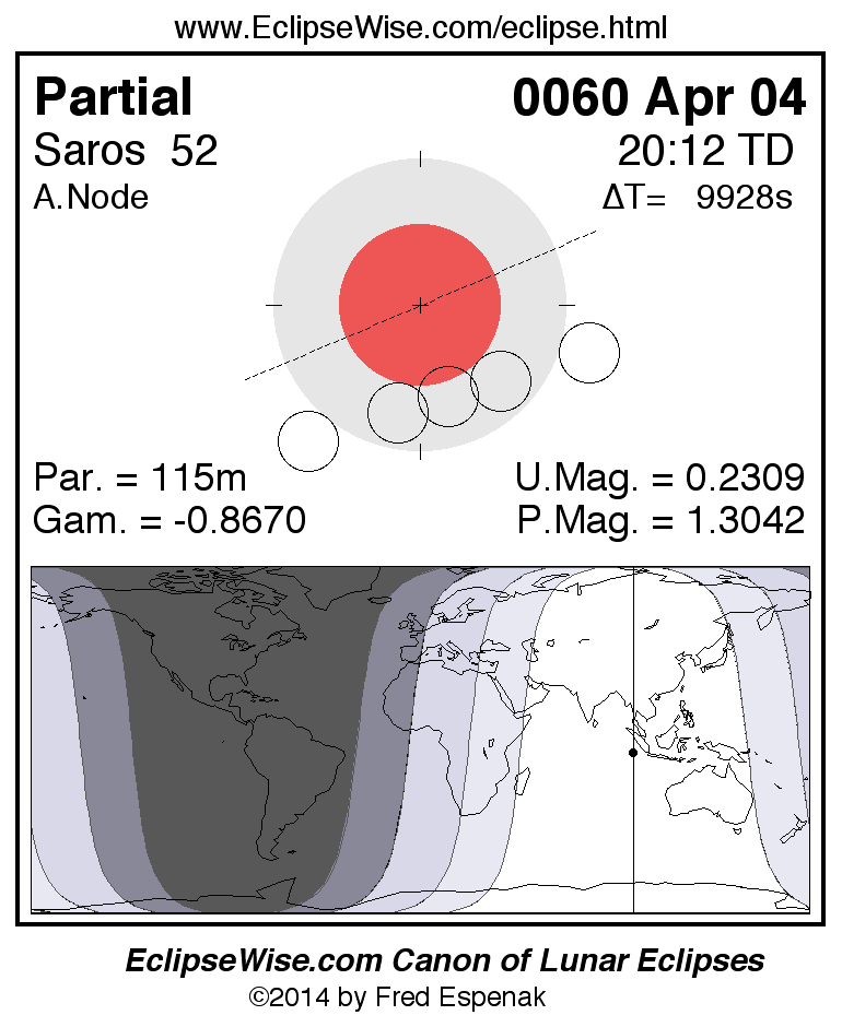 The partial lunar eclipse of 0060 Apr 04 is followed two weeks later by a total solar eclipse on 0060 Apr 19.