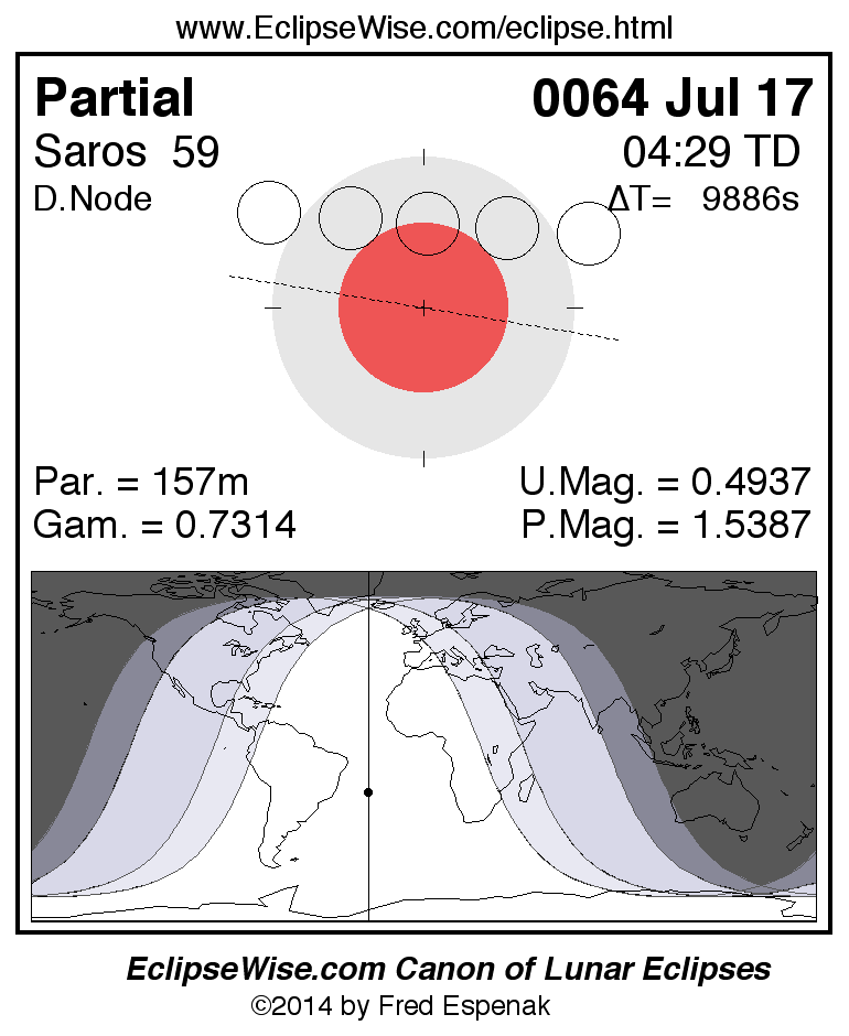 The instant of greatest eclipse takes place on 0064 Jul 17 at 04:28:31 TD (01:43:47 UT1).