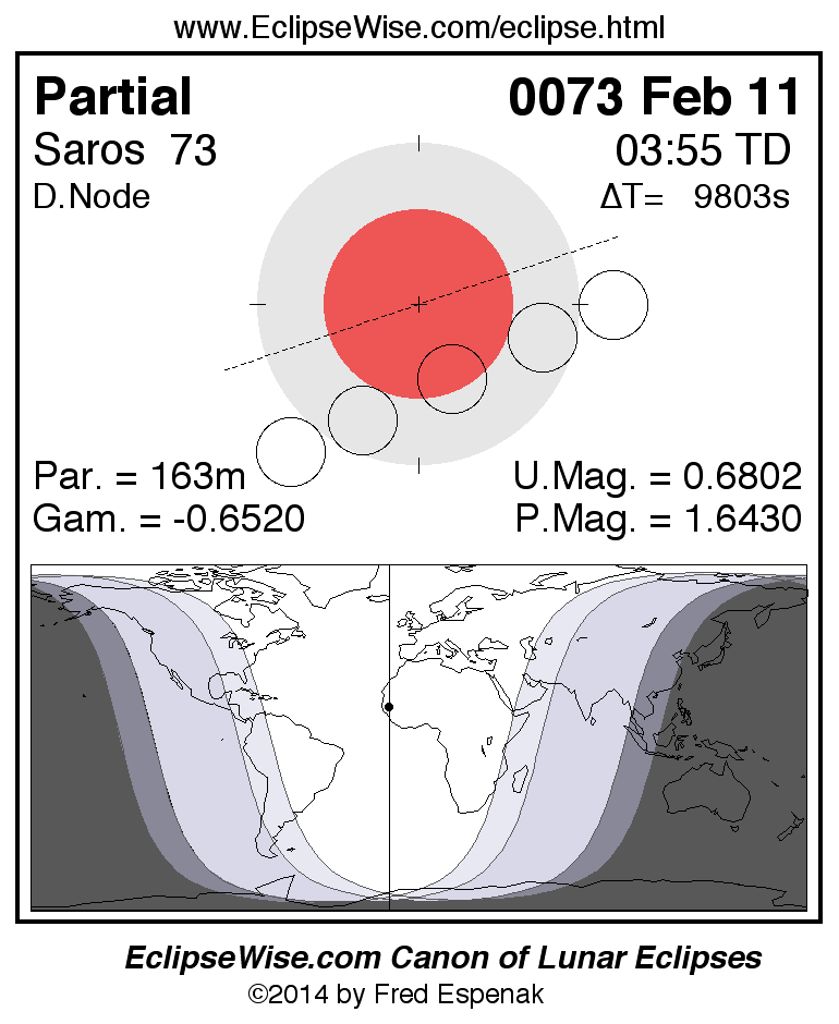 The partial lunar eclipse of 0073 Feb 11 is preceded two weeks earlier by a annular solar eclipse on 0073 Jan 27.