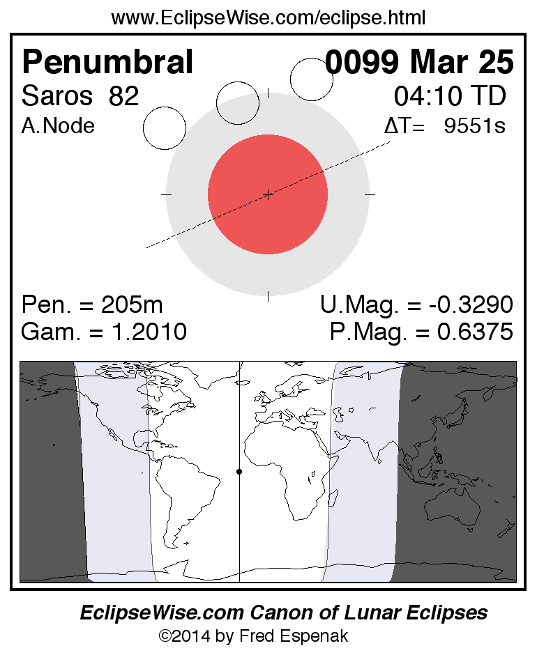 Another lunar eclipse occurs one synodic month before the 0099 Mar 25 eclipse. It is the penumbral lunar eclipse of 0099 Feb 23.