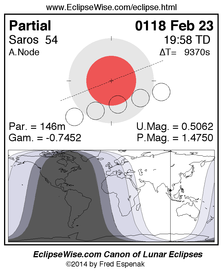 The partial lunar eclipse of 0118 Feb 23 is followed two weeks later by a annular solar eclipse on 0118 Mar 10.
