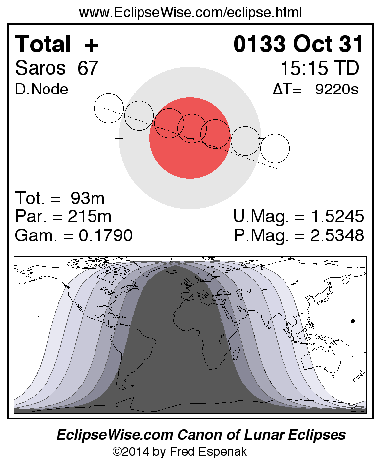 The total lunar eclipse of 0133 Oct 31 is followed two weeks later by a partial solar eclipse on 0133 Nov 14.