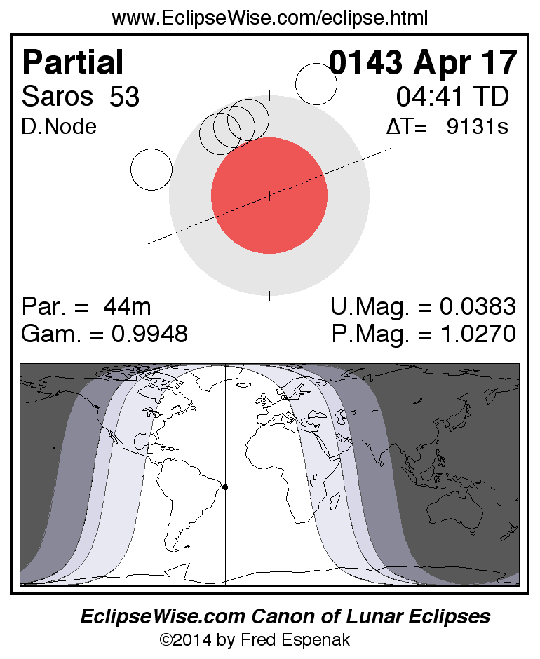 The partial lunar eclipse of 0143 Apr 17 is followed two weeks later by a hybrid solar eclipse on 0143 May 02.