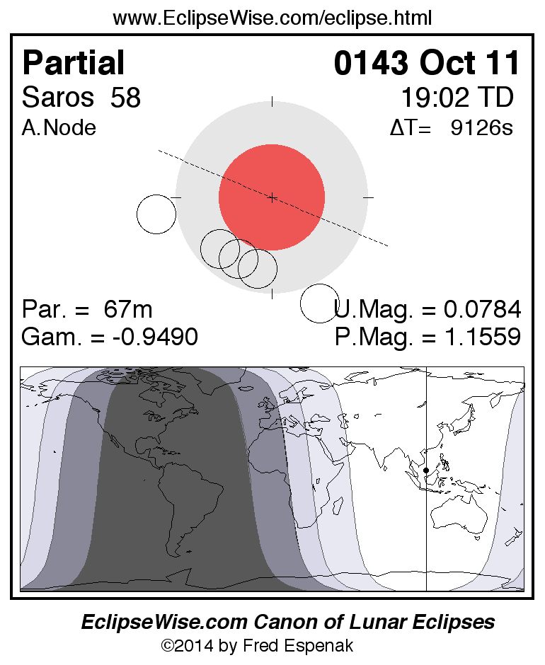 The partial lunar eclipse of 0143 Oct 11 is followed two weeks later by a hybrid solar eclipse on 0143 Oct 25.
