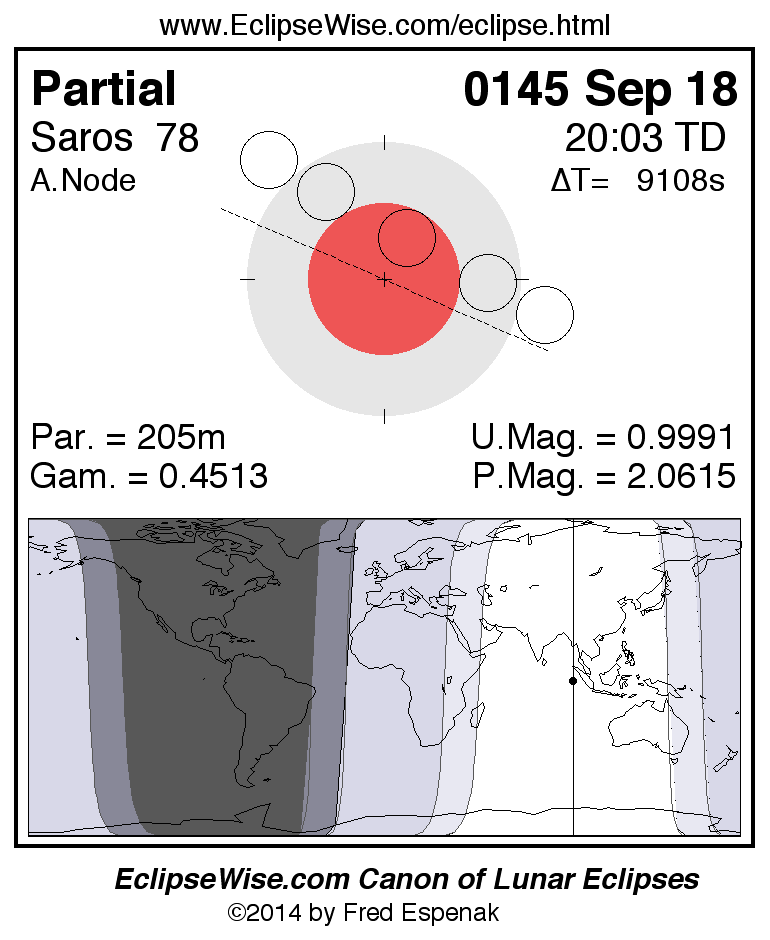 The partial lunar eclipse of 0145 Sep 18 is preceded two weeks earlier by a total solar eclipse on 0145 Sep 04.