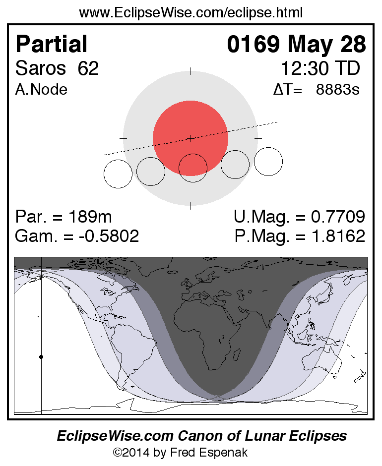 The partial lunar eclipse of 0169 May 28 is followed two weeks later by a total solar eclipse on 0169 Jun 12.