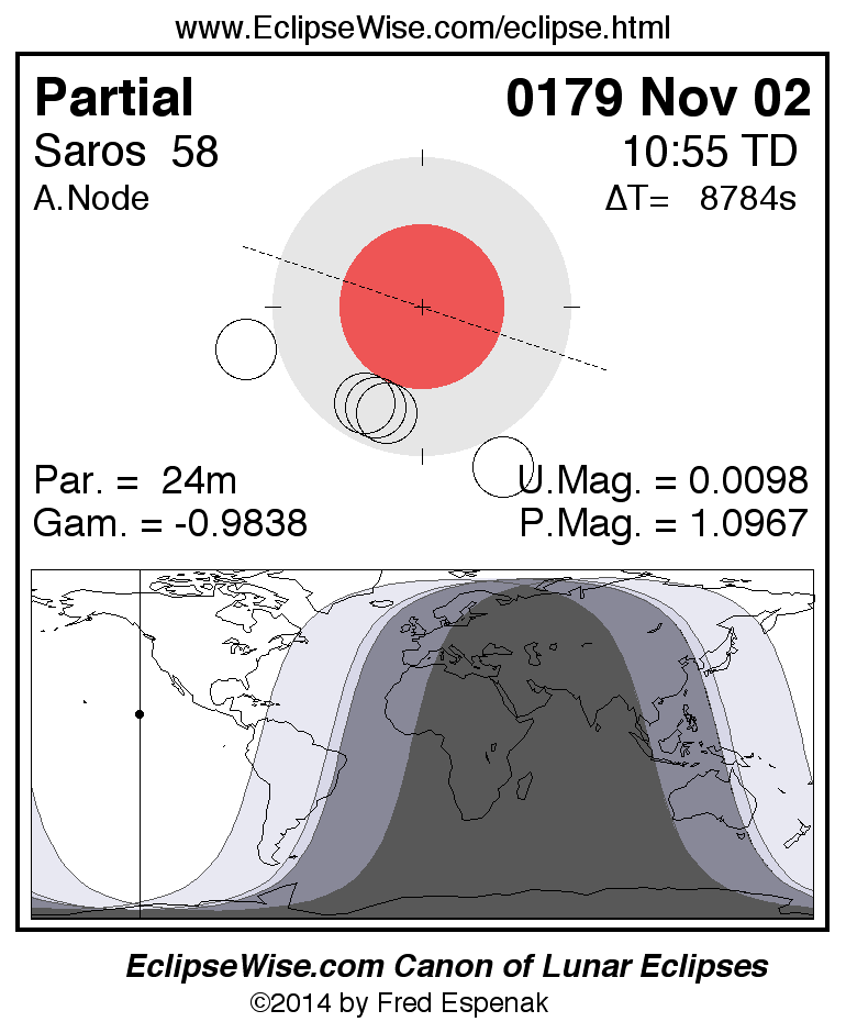 The partial lunar eclipse of 0179 Nov 02 is followed two weeks later by a total solar eclipse on 0179 Nov 16.