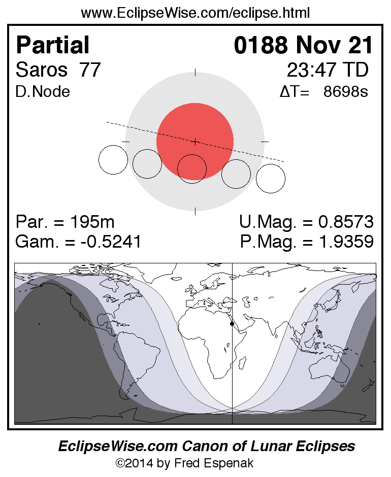 The partial lunar eclipse of 0188 Nov 21 is preceded two weeks earlier by a total solar eclipse on 0188 Nov 06.