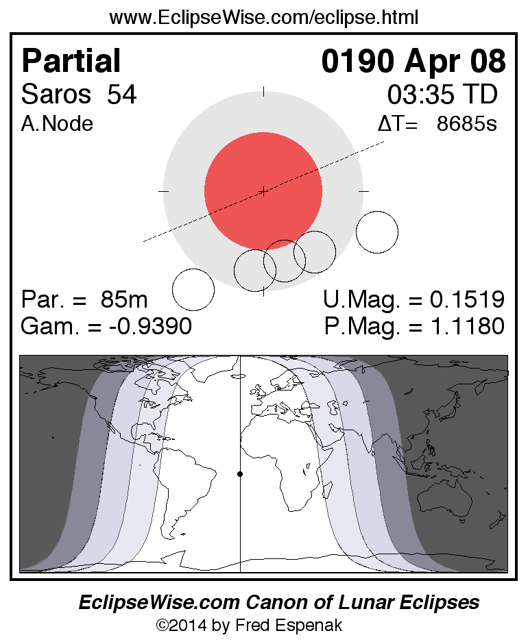 The partial lunar eclipse of 0190 Apr 08 is followed two weeks later by a annular solar eclipse on 0190 Apr 22.