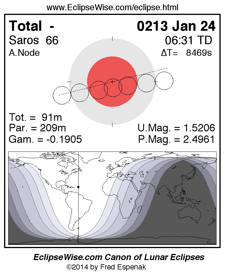 The total lunar eclipse of 0213 Jan 24 is followed two weeks later by a partial solar eclipse on 0213 Feb 08.