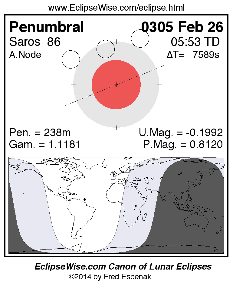 The penumbral lunar eclipse of 0305 Feb 26 is preceded two weeks earlier by a annular solar eclipse on 0305 Feb 10.