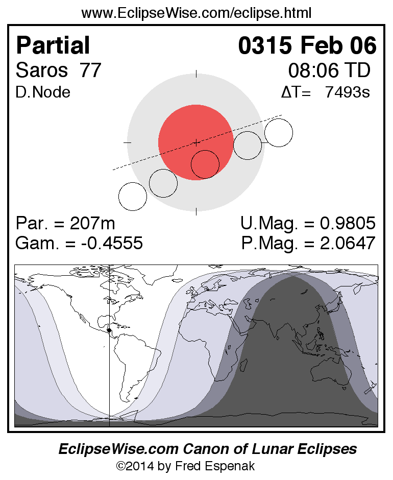 The instant of greatest eclipse takes place on 0315 Feb 06 at 08:05:60 TD (06:01:08 UT1).