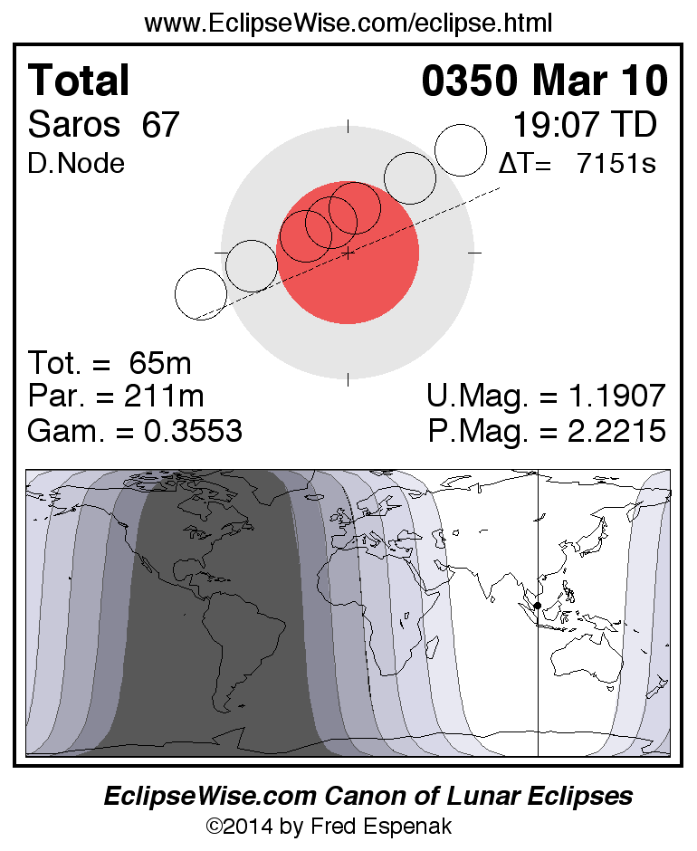 The instant of greatest eclipse takes place on 0350 Mar 10 at 19:06:34 TD (17:07:24 UT1).